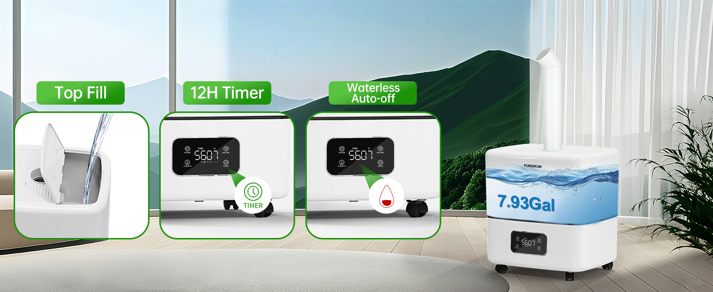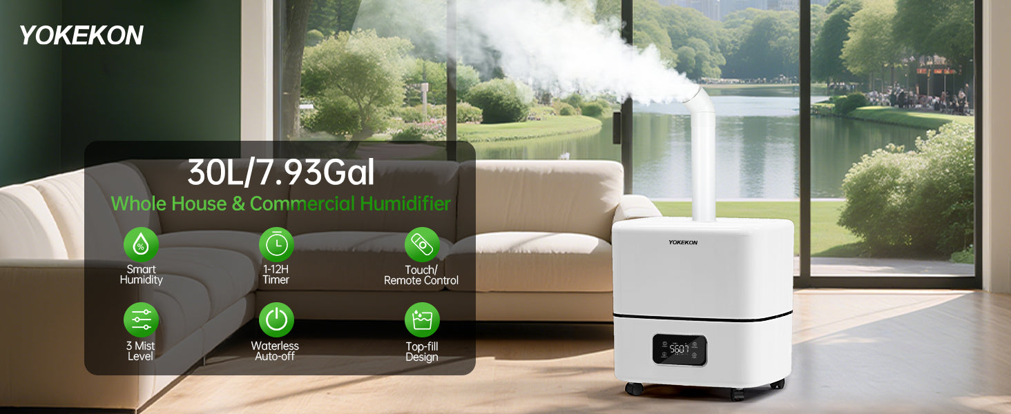 7.93Gal commercial humidifier with 10-core atomizer, 3 mist levels & external sensor. Perfect for large rooms, greenhouses, and warehouses up to 5000 sq ft.