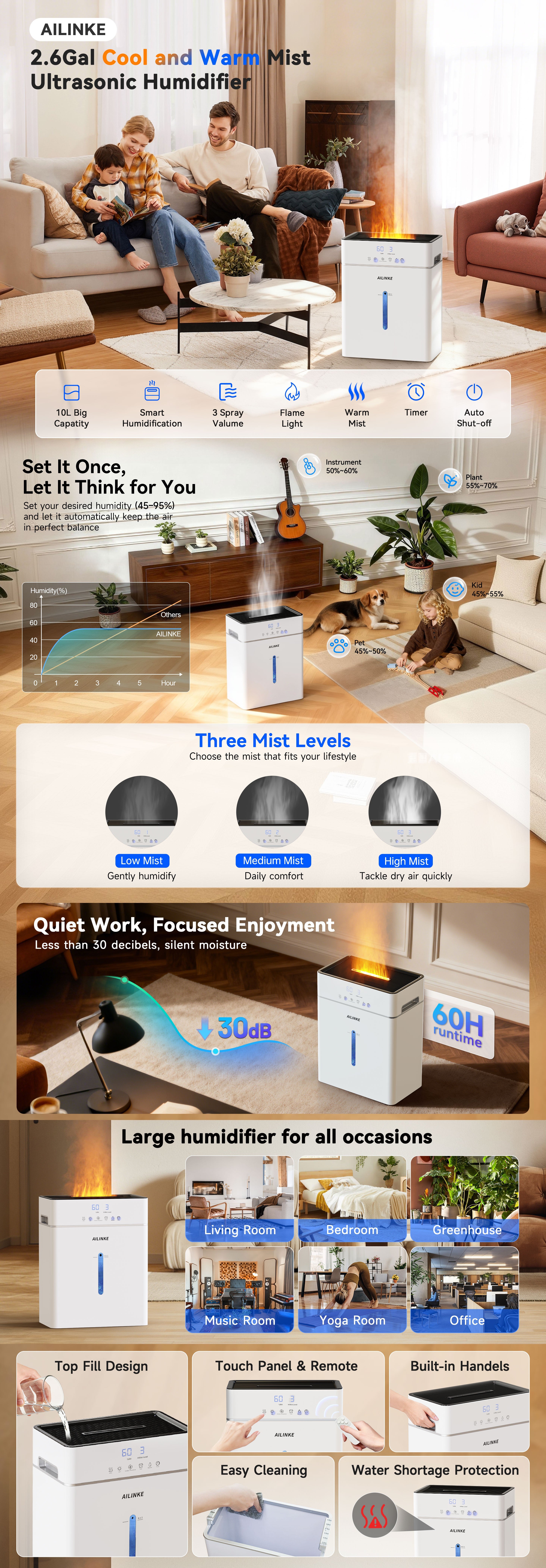 Experience ultimate comfort with this 10L/2.64Gal Warm & Cool Mist Humidifier, designed for large rooms up to 1000 sq.ft. Featuring ultrasonic thermal mist technology, it relieves dry skin and nasal discomfort while maintaining ideal humidity. The flame light effect adds a cozy ambiance to your space. Enjoy 3 mist levels, smart humidity control (45–95%), 12H timer, and ultra-quiet 30dB operation. Perfect for bedrooms, plants, offices, and whole-home use.
